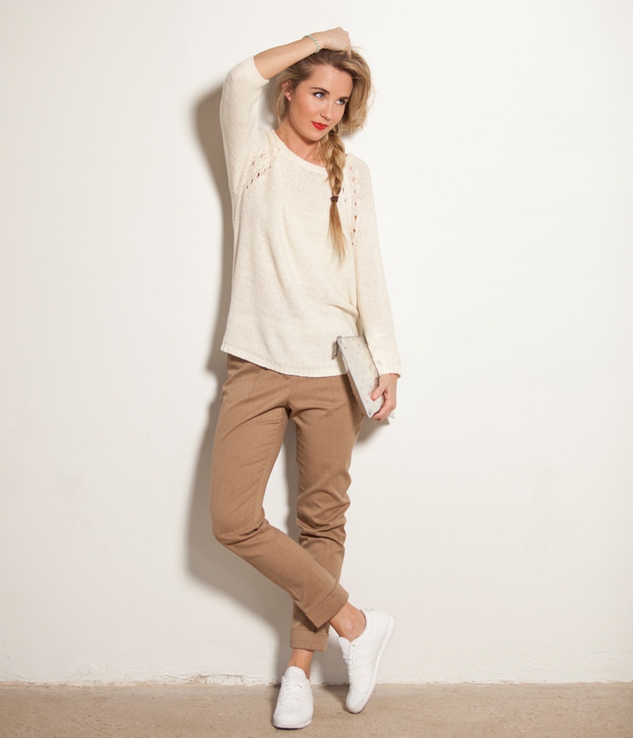 | Đứng đắn hơn với chiếc quần trắng, bạn có thể diện trang phục này đến công sở mà không sợ bụi bặm quá. |