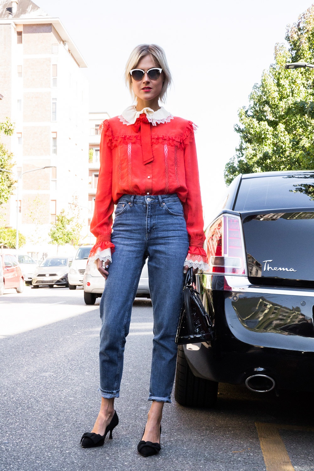 Một biến thể nữ tính khác của quần jeans cạp cao khi kết hợp áo sơ mi đăng-ten cầu kỳ. |