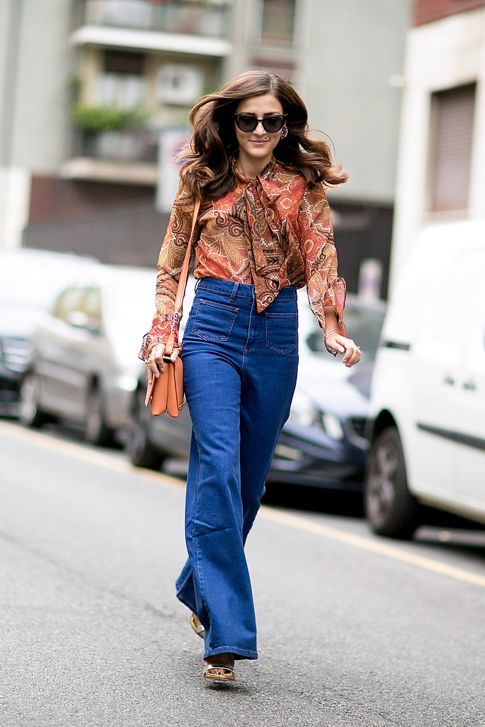 Hình ảnh cô nàng thập niên 1970 với áo sơ mi họa tiết nền nã. |