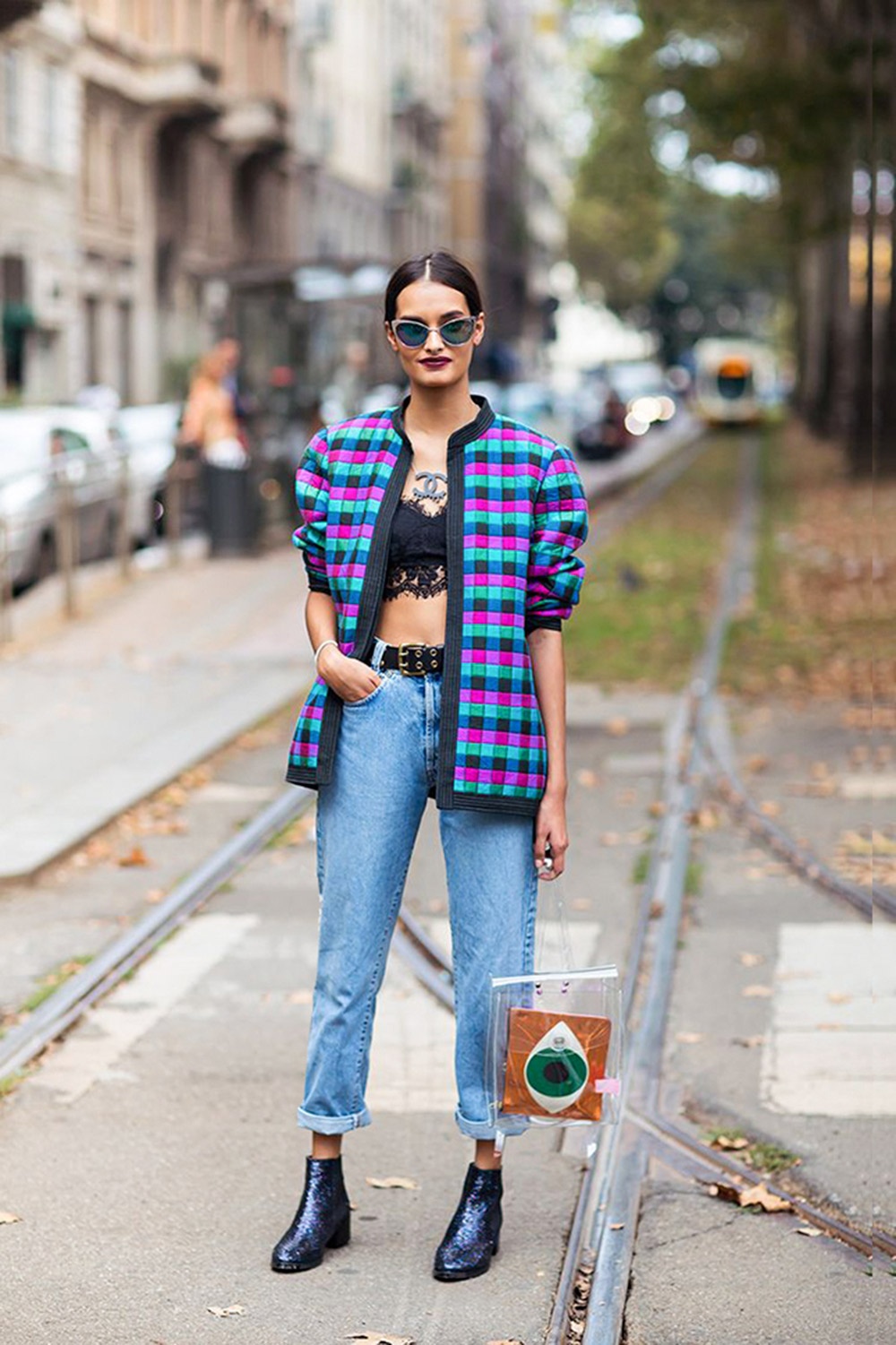 Tín đồ thời trang này mix quần jeans cạp cao cùng bra top và áo khoác caro sắc màu. Với set đồ này, bạn nên chọn bốt hoặc sneakers để hoàn thiện phong cách. |