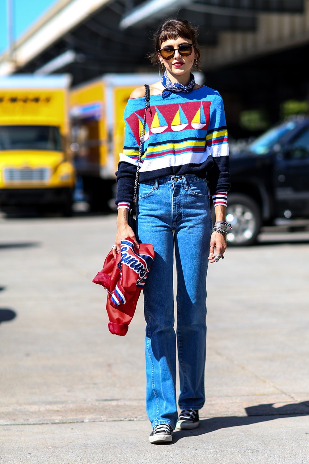 Nếu bạn yêu thích phong cách vintage, có thể thử phối quần jeans cạp cao cùng sweater kéo lệch vai. Điểm nhấn của trang phục nằm ở phần khăn thắt duyên dáng cổ điển. |