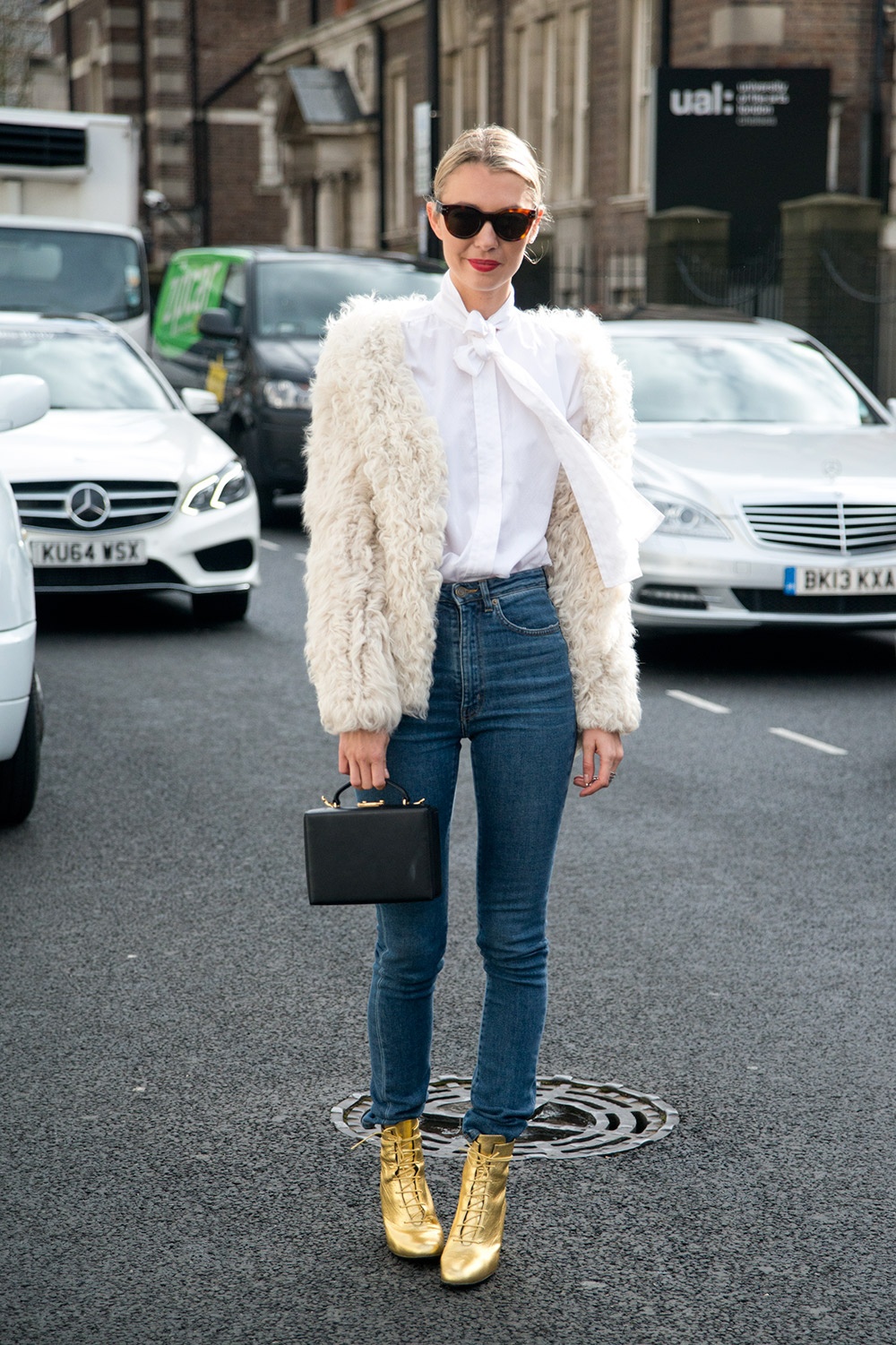 Một tổng hòa hoàn hảo từ các item trendy nhất: sơ mi trắng, áo khoác lông, bốt ánh kim và túi xách mini. |