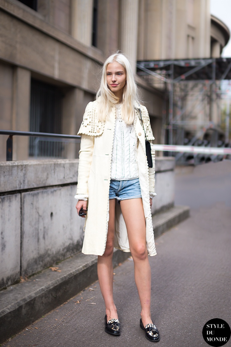 Sasha Luz sở hữu một gương mặt đẹp và mái tóc bạch kim quyến rũ. Phong cách thường ngày của cô gái này khá đơn giản với sự kết hợp của chiếc áo khoác coat dài màu nude cùng áo len và quần shorts và đôi giày búp bê. |