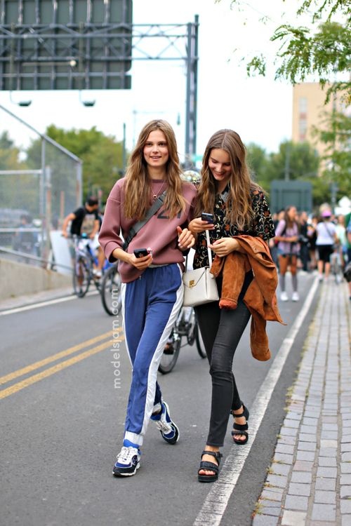 | Tilda Lindstam khỏe khoắn trong trang phục thể thao và Julia Nobis đơn giản với sơ mi họa tiết cùng quần jeans. |