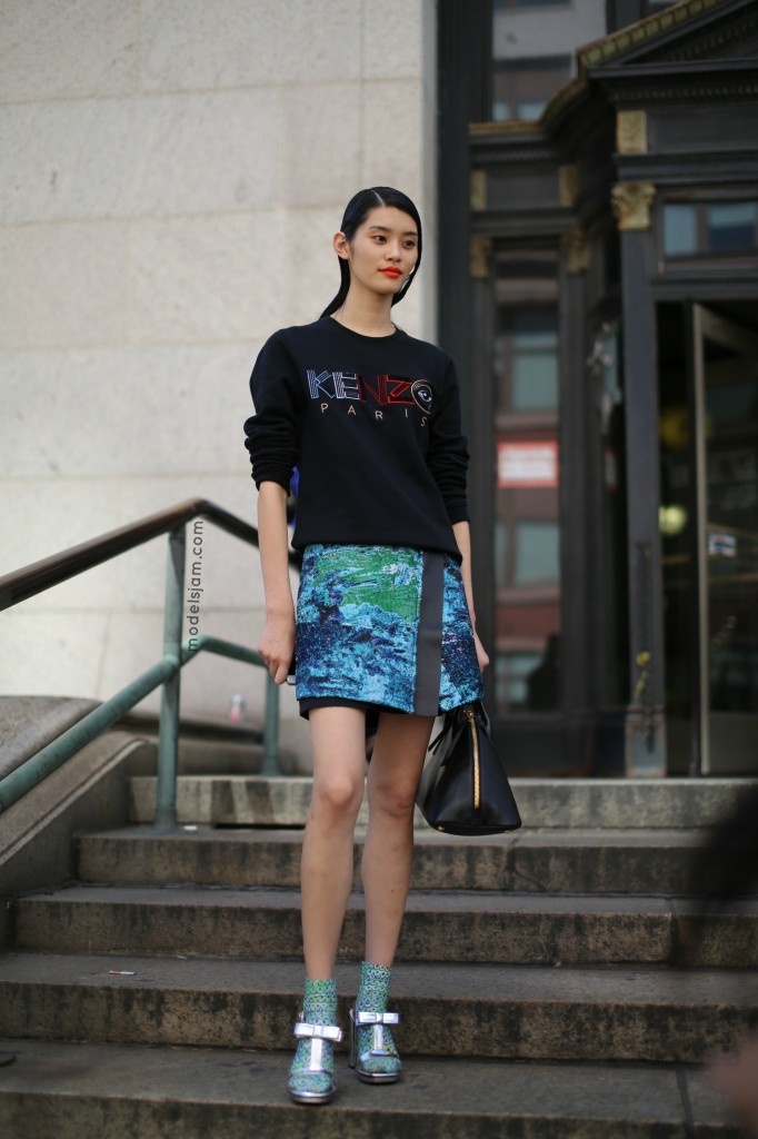 | Ming Xi kết hợp áo sweater của Kenzo cùng chân váy xòe, phụ kiện là chiếc túi xách da và đôi giày cao gót ánh kim nổi bật. |