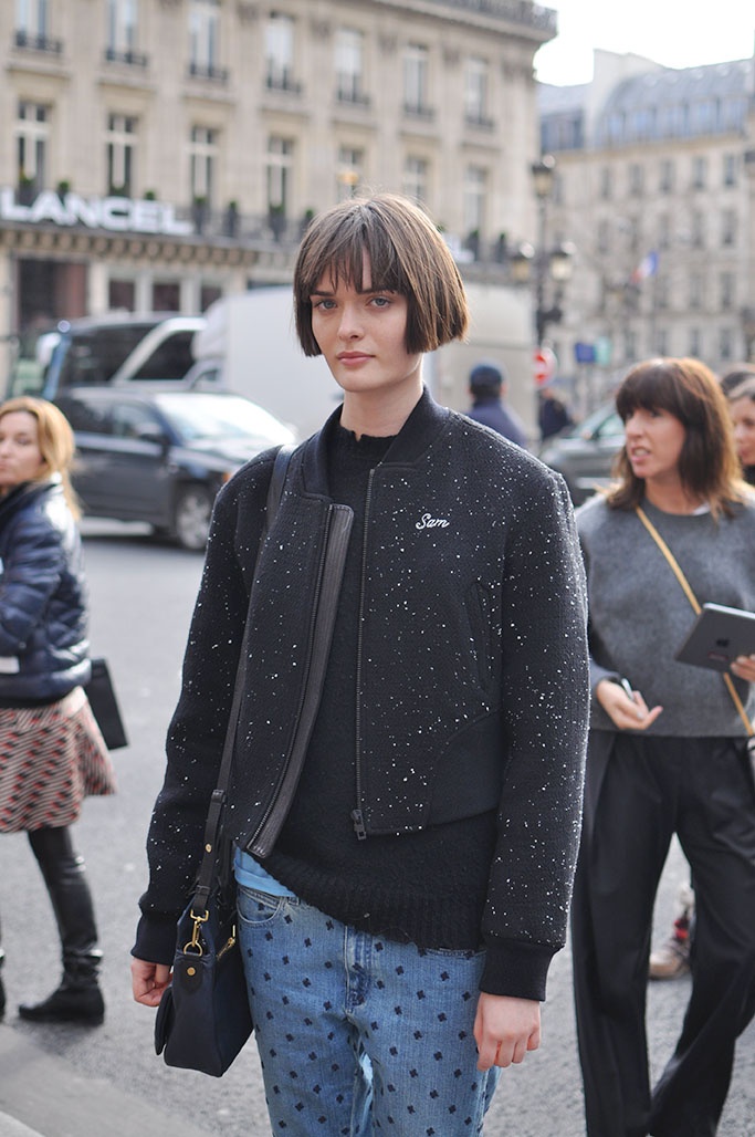 | Ava Smith với phong cách tomboy khi mix áo khoác bóng chày hoa với quần jeans boyfriend và giày đế bệt. |