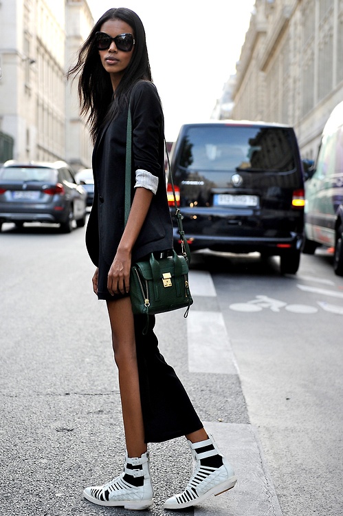 | Grace Mahary diện váy đen với đường cắt tuyệt vời cùng áo khoác blazer và đôi boots cổ điển màu trắng. |