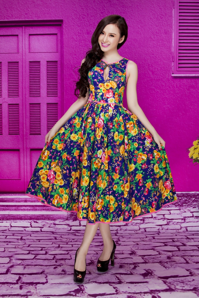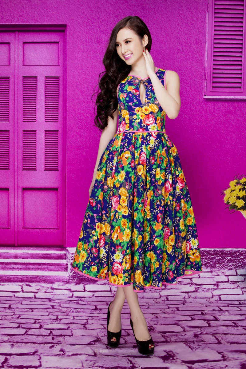 | Đầm dáng dài tôn vóc dáng yêu kiều, họa tiết in hoa nền nã, đường xẻ chân váy hút ánh nhìn. |