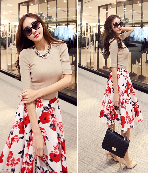 | Một chiếc váy xòe họa tiết hoa đỏ rực rỡ kết hợp với áo gam màu nền nã và giày cao gót màu nude sẽ mang đến cho bạn vẻ đẹp nữ tính và duyên dáng. |