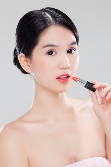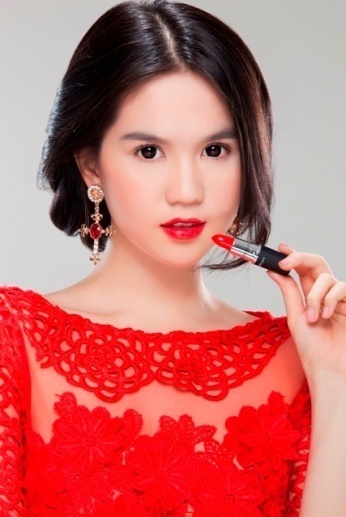 Theo cô, để tô son đỏ đẹp và hài hòa, bạn gái chỉ nên trang điểm khuôn mặt nhẹ nhàng, chuốt mascara cho mi thật cong và dày. Son đỏ chính là điểm nhấn cho phong cách này. Ngọc Trinh tô son lì màu đỏ neon của son môi Cos Royale (#1).