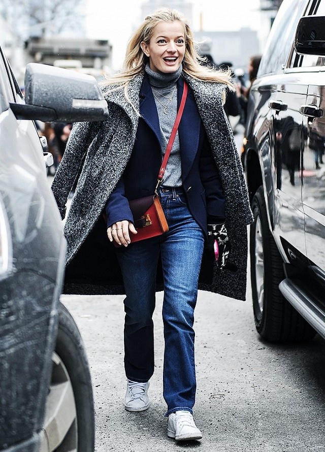 Áo bomber jacket, áo cao cổ và quần jeans ống rộng cũng là sự kết hợp lý tưởng trên phố. |