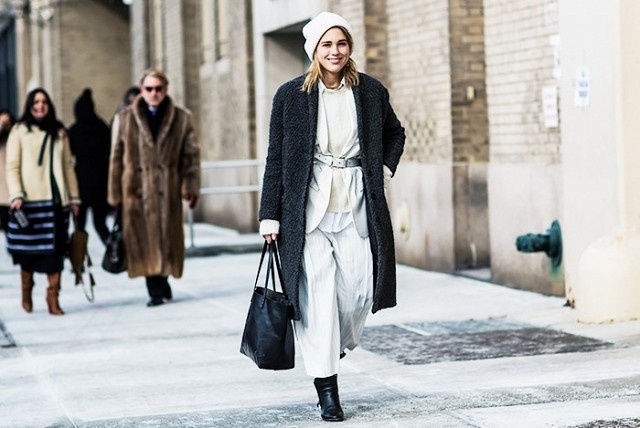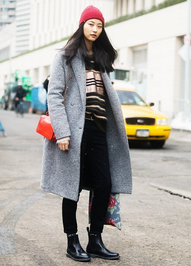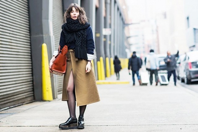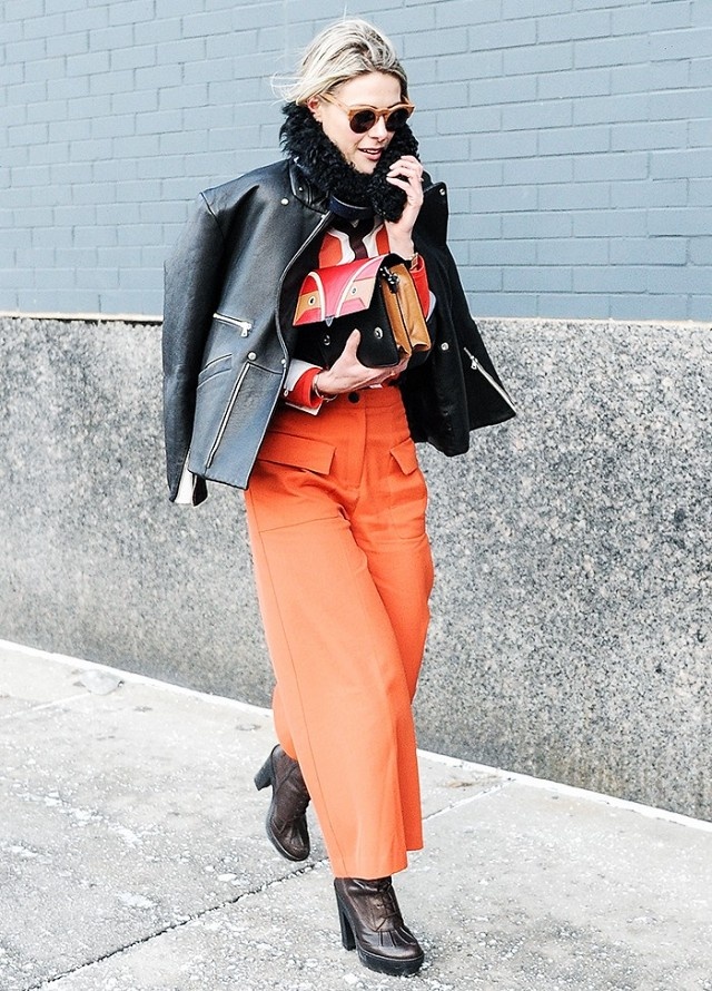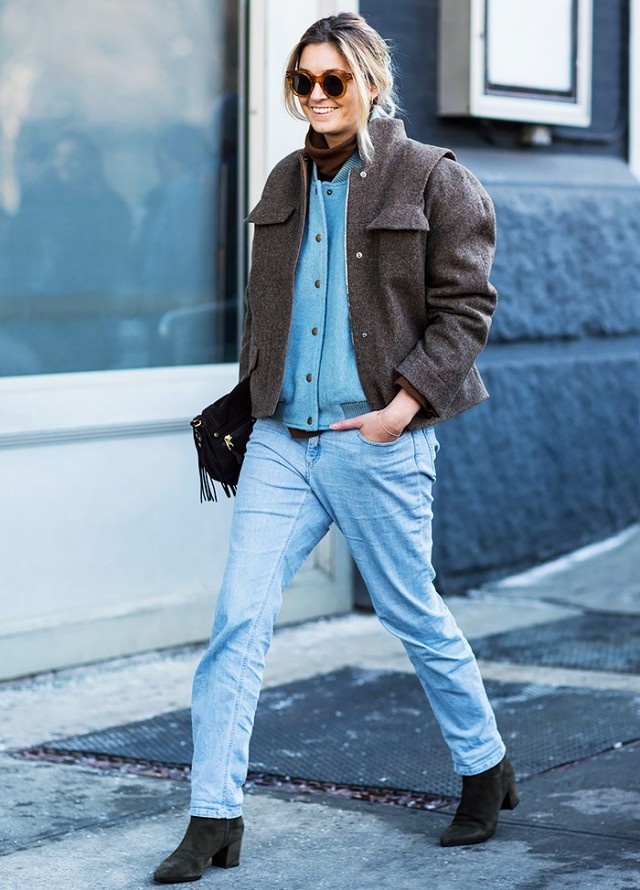 Set đồ layer với áo khoác, blazer, áo len, quần jeans/culottes và bốt xuất hiện nhiều trên đường phố New York với đa dạng màu sắc. |