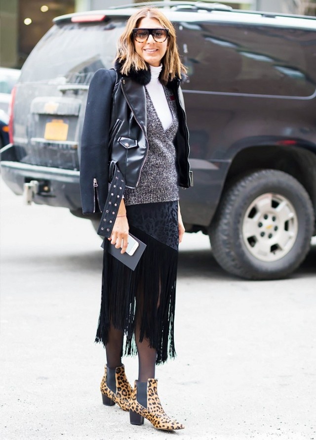Chiếc váy tua rua mang lại vẻ uyển chuyển khi kết hợp với jacket moto, áo sweater và bốt họa tiết da báo. |