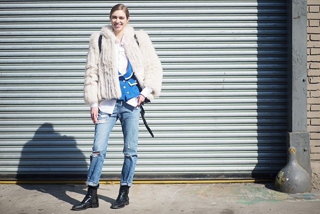 Sự tương phản thú vị giữa 2 gam màu trắng của áo sơ mi, áo khoác lông với gam xanh của blazer và quần jeans. |