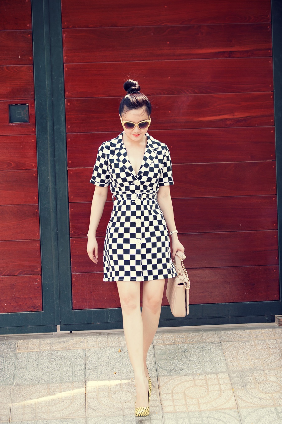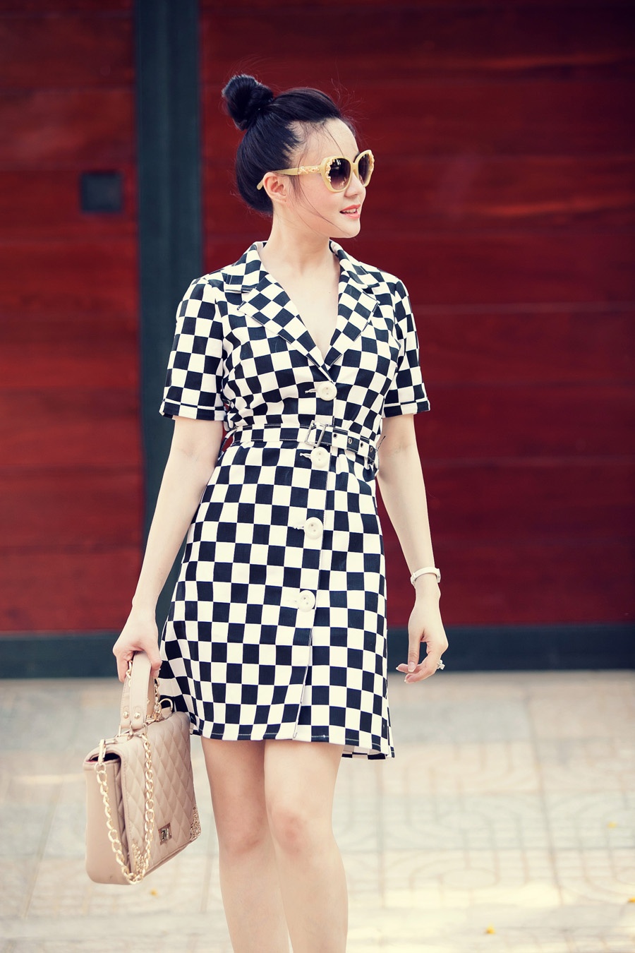 | Họa tiết ô vuông vốn được xem là đặc trưng của phong cách cổ điển nên khá phù hợp với vẻ đẹp thuần chất Á châu của nữ ca sĩ. Khi khoác lên mình bộ cánh hợp xu hướng, cô kết hợp cùng giày cùng họa tiết tông vàng nổi bật, phụ kiện là túi xách Chanel đắt đỏ có tông màu pastel.