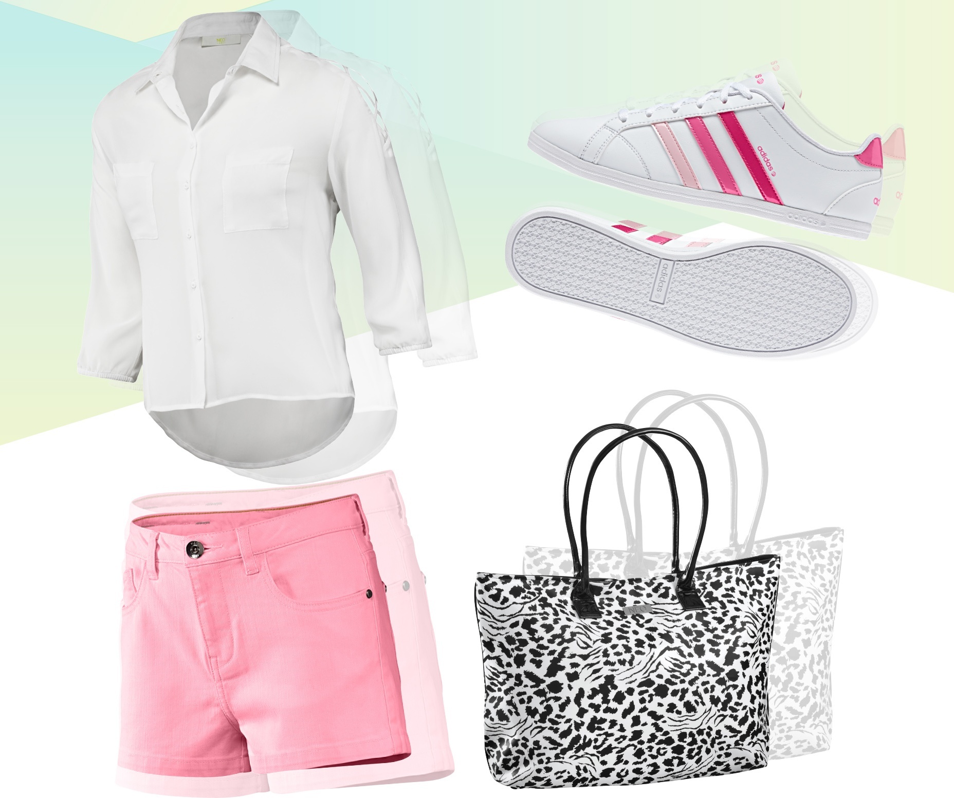 | Vẫn chiếc túi xách to bản nhưng khi phối với áo sơmi trắng cổ điển và quần soóc màu hồng trông bạn sẽ thật nữ tính, thành lịch. Đừng quên đôi giày trắng với những sọc hồng, đây là điểm nhấn cho bộ trang phục của bạn. |