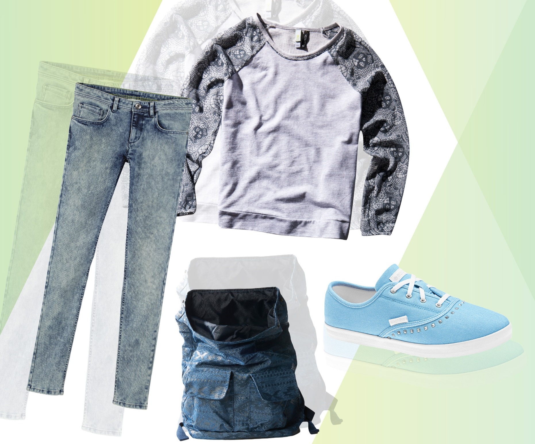 | Còn đây là bộ trang phục cho những ngày trời lạnh: quần jeans - sự lựa chọn hàng đầu của các bạn gái để khoe đôi chân dài, thẳng; và áo thun dài tay màu xám giữ cho bạn sự ấm áp. Ngoài ra, đừng quên đôi giày màu xanh thành lịch và chiếc ba lô cùng màu. |
