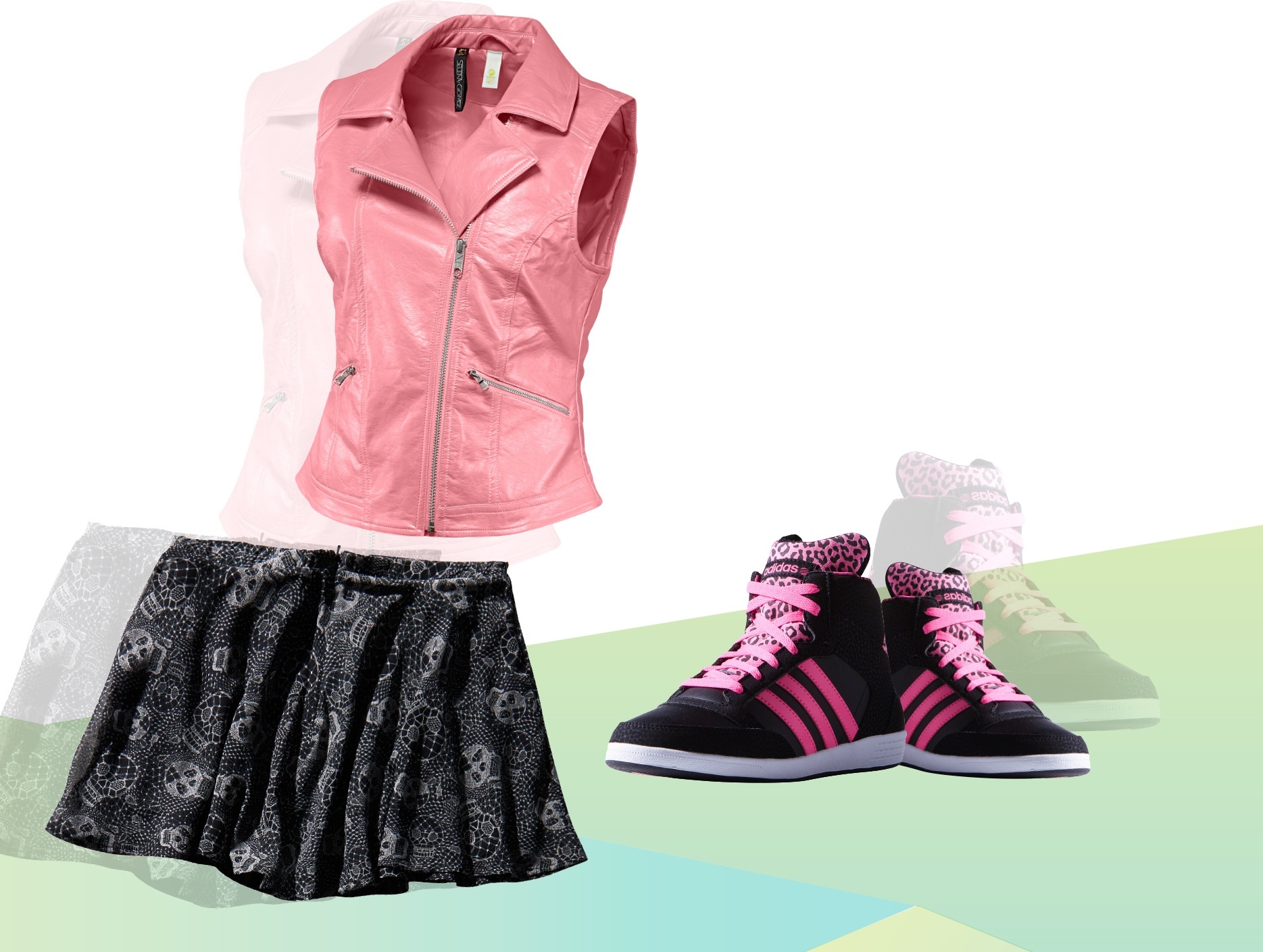 | Áo da không bao giờ là lỗi mốt, nhất là một chiếc áo gilê màu hồng đẹp như thế này. Kết hợp với váy ngắn đen và giày adidas, bạn gái sẽ vừa duyên dáng, vừa trẻ trung và vô cùng hợp mốt. |