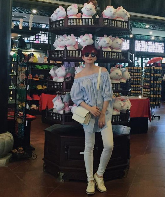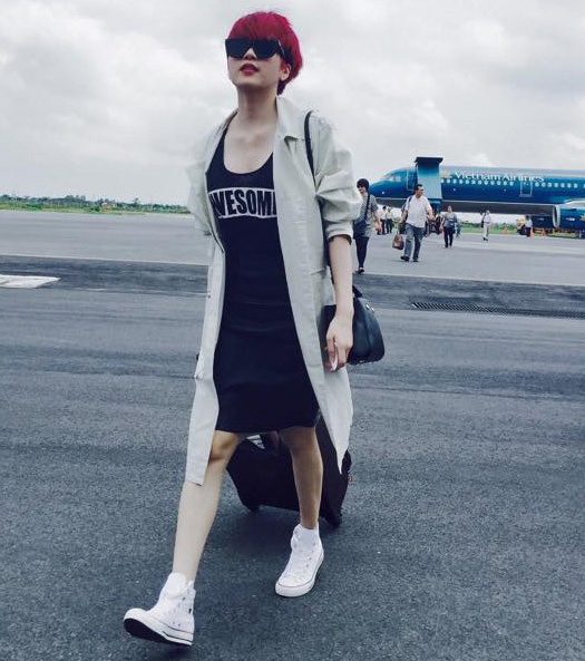 | Giày thể thao và áo thun thoải mái để tiện cho việc di chuyển là lựa chọn của Thiều Bảo Trâm mỗi khi xuống phố |