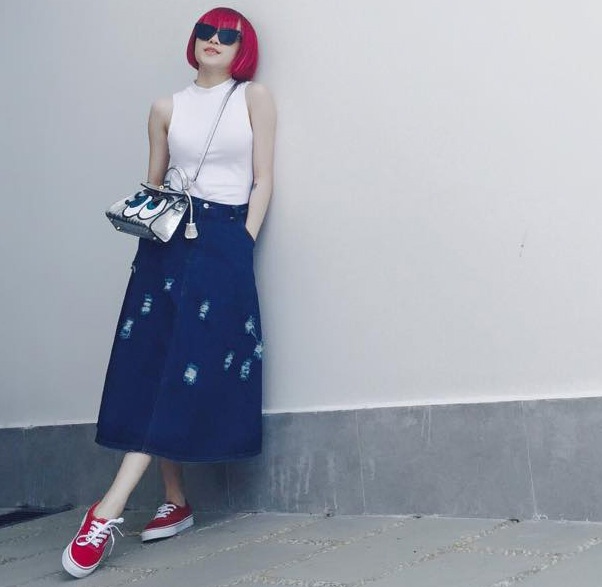 | Đôi lúc Thiều Bảo Trâm lại nữ tính với chân váy rộng kết hợp cùng áo thun và túi đeo chéo. |
