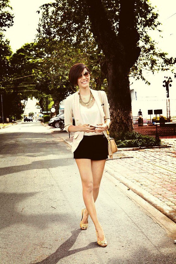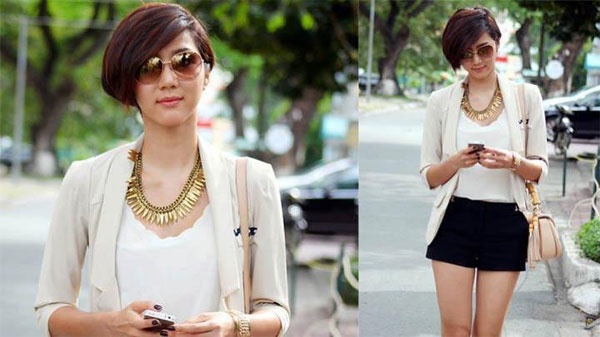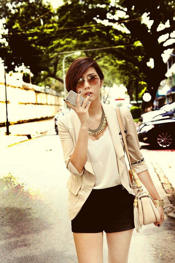 | Quần short không chỉ là mốt hot trong ngày hè mà những ngày mùa thu, bạn hoàn toàn có thể diện đều làm điệu cho diện mạo của mình. Bạn có thể chọn cách kết hợp với áo sơ mi bên trong hoặc thêm một áo khoác mỏng bên ngoài như của Hồ Ngọc Hà. Kiểu ăn mặc này thích hợp với những buổi đi chơi dạo phố hoặc mua sắm. |