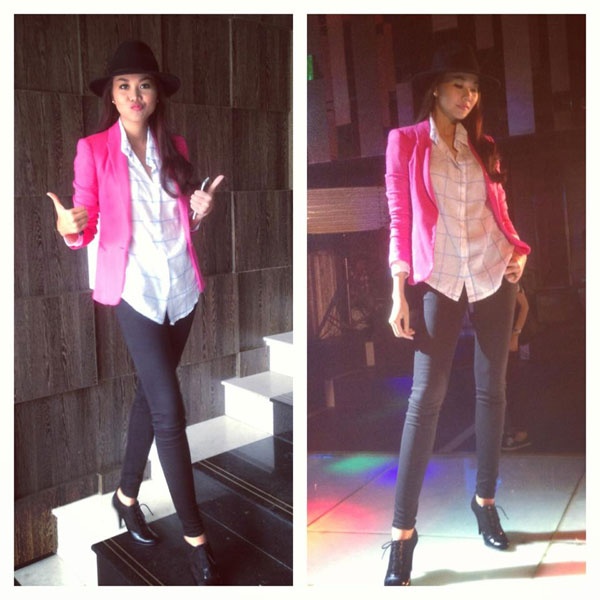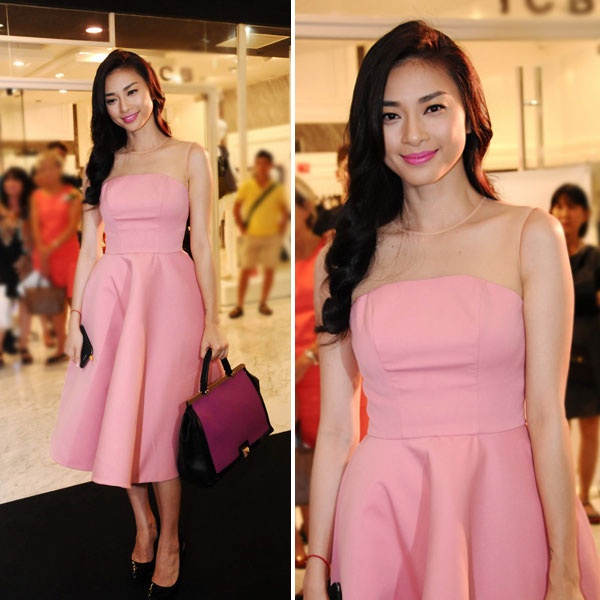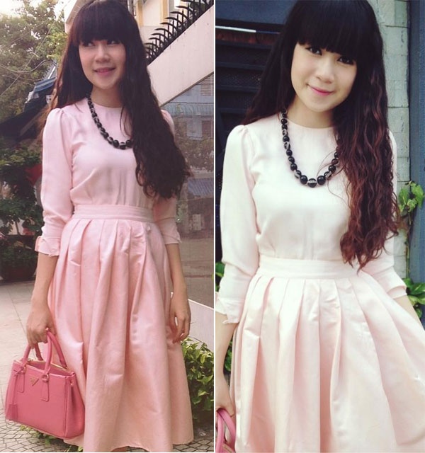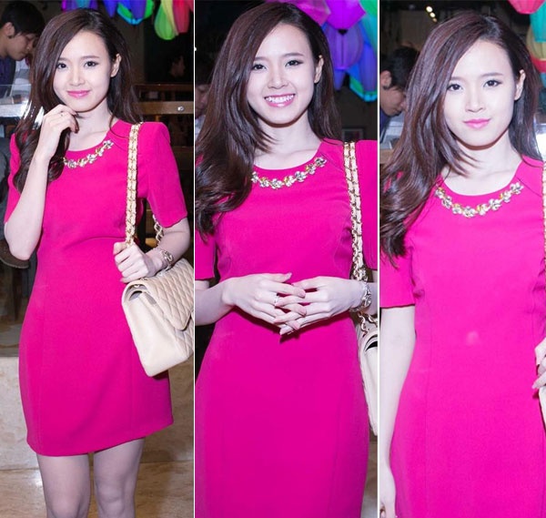 | Mặc váy hồng và xách túi hồng như Minh Hà cũng chẳng kém phần đáng yêu. |