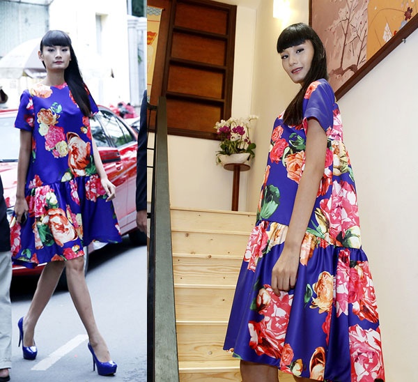 Lê Thúy tự tin khoe dáng khi diện váy xuông kiểu cách, hoa văn sặc sỡ.