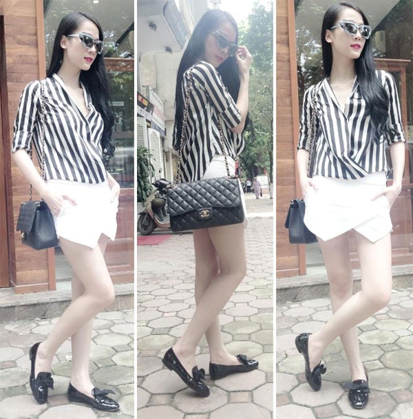 | Vẻ đẹp xinh xắn và đáng yêu của bạn sẽ toát lên nếu mặc áo sơ mi kẻ dài tay, quần short trắng và giày búp bê như Thái Hà. Thêm kính đeo mắt và túi đựng những vật dụng nhỏ xinh sẽ rất thời trang. |