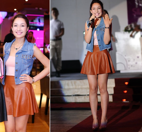 Bạn gái lứa tuổi teen nên chọn cách phối như Anna Trương. Chân váy da, áo dây bên trong và khoác denim ba lỗ vừa trẻ trung lại cá tính.