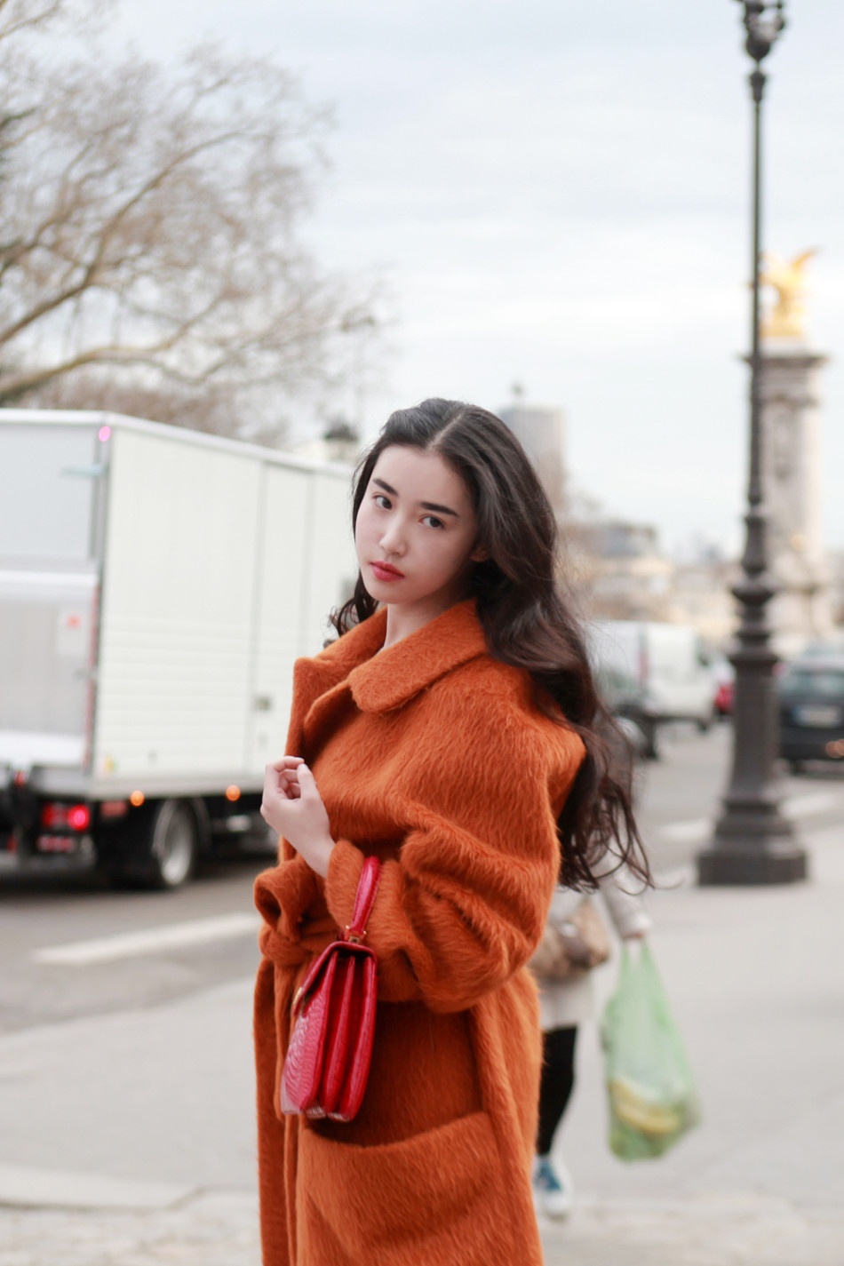 | Với chiếc áo choàng lông màu cam rực rỡ và túi xách đỏ, Trương Tân Uyển nổi bật giữa một ngày ảm đảm của Milan khi tham dự show trình diễn của Shiatzy Chen. |