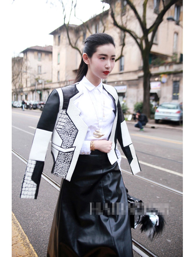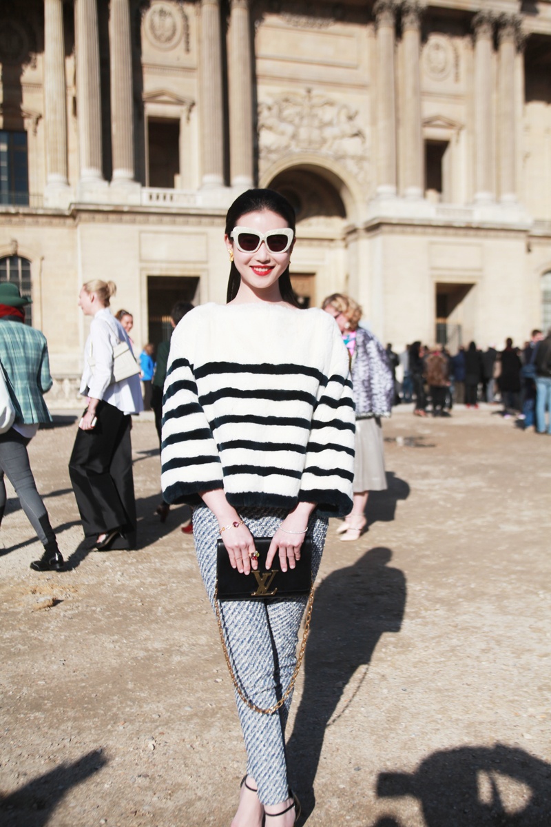 | Mỹ nhân Hoa ngữ quý phái với chiếc áo lông kẻ đen trắng của Louis Vuitton kết hợp hoàn hảo với chiếc túi dây vàng và hoa tai vàng độc đáo. |