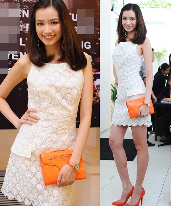| Chiếc váy trắng chất liệu ren kiểu dáng đơn giản nhưng lại khiến Trúc Diễm toát lên vẻ đẹp trẻ trung. Gam màu cam của phụ kiện càng làm cô nổi bật trên nền váy trắng. |