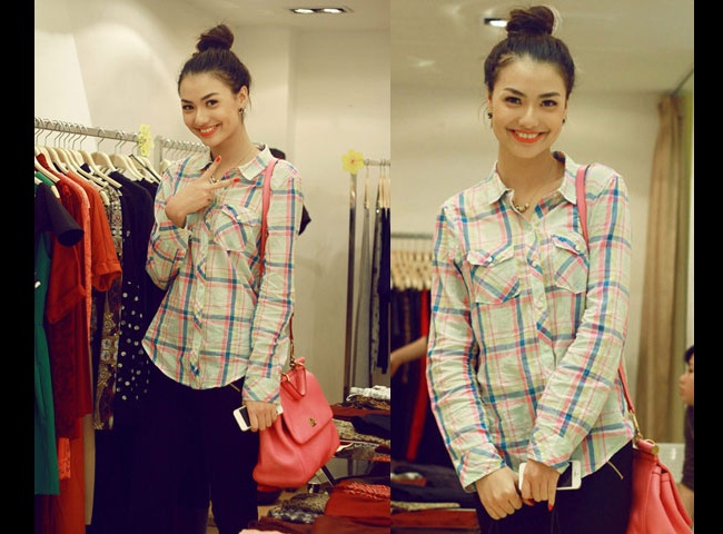 | Tuy nhiên, dường như chân dài này đã ý thức hơn trong việc giữ gìn hình ảnh. Trông cô nàng thật duyên dáng và trẻ trung với áo sơ mi hồng. |