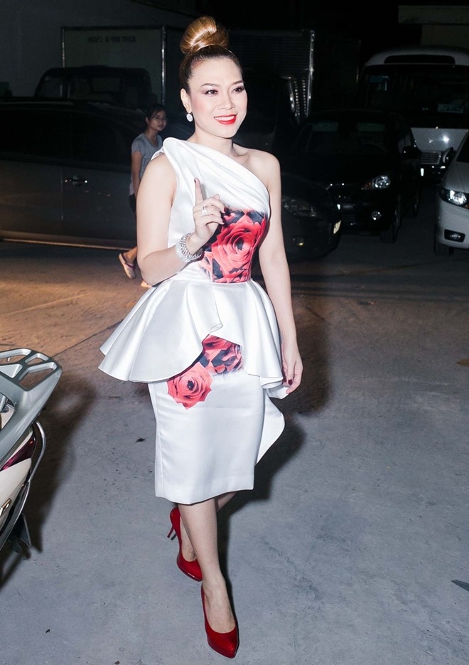Chiếc đầm peplum với bông hoa hồng đỏ rực là một lựa chọn không được đánh giá cao của Mỹ Tâm. Phần vai lệch khiến cổ cô bị ngắn lại, còn những đường bèo nhún lại khiến phần thân dưới của cô trở nên nặng nề.