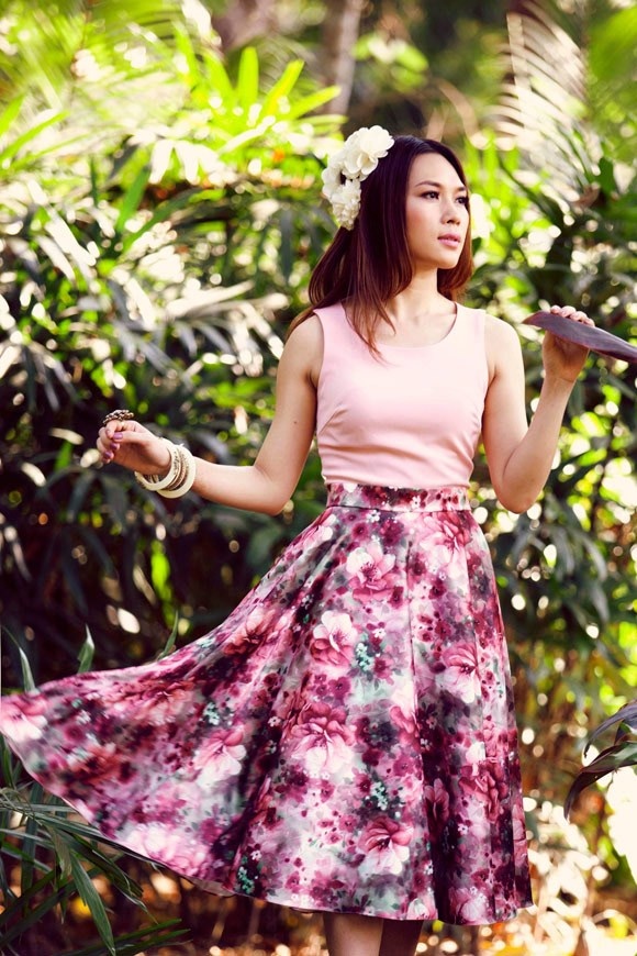 Thêm một lựa chọn khéo léo của Mỹ Tâm với đầm midi hoa và áo hồng pastel.