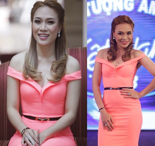 | Đầm ôm sát với phần vai ngang rất hợp với phong cách của Mỹ Tâm. |