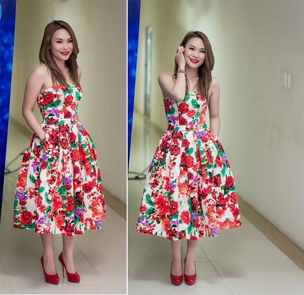 | Đầm midi hoa đỏ rực rỡ giúp cô trẻ thêm vài tuổi. |