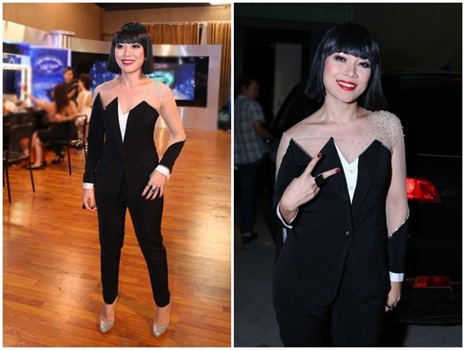 | Nếu như không có chiếc vòng cổ nặng nề, Mỹ Tâm đã có bộ trang phục trắng đen rất hoàn hảo. |