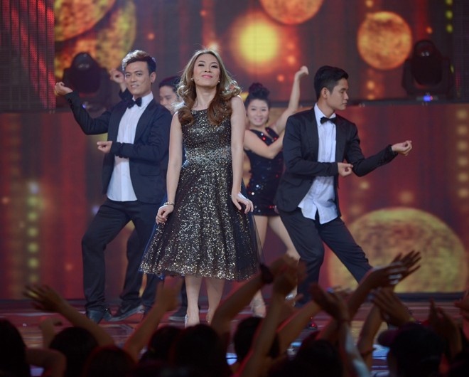 | Đầm vàng tha thướt với những đường xẻ táo bạo giúp Mỹ Tâm tỏa sáng trên sân khấu. |
