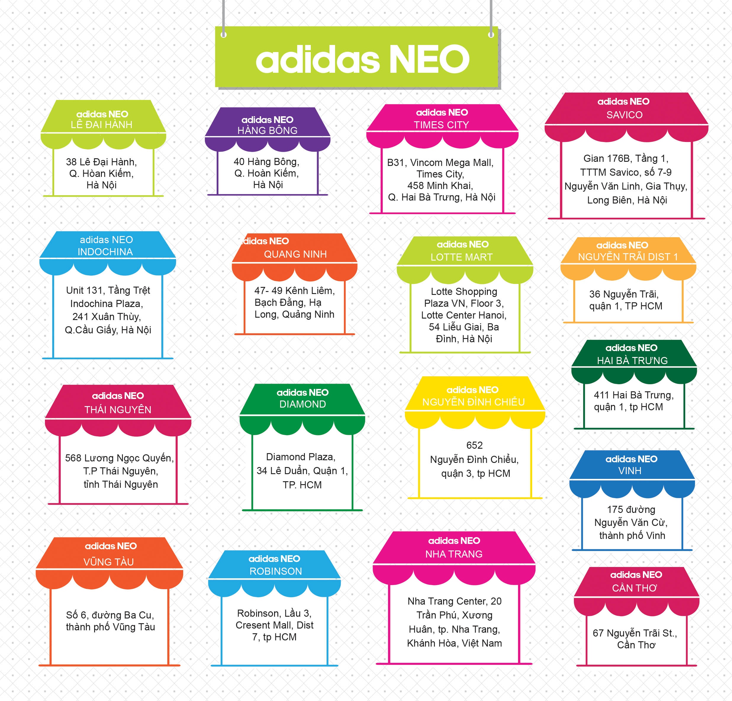 | Hệ thống cửa hàng chính thức của NEO. Ngoài ra, để cập nhật những thiết kế mới nhất và thông tin về adidas NEO, độc giả truy cập bit.ly/adidasvn. |