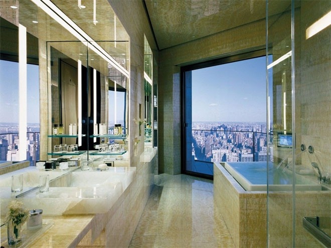 Căn phòng ban đầu được thiết kế dành riêng cho tỷ phú Ty Warner, người mua lại khách sạn Four Seasons ở New York vào năm 1999. Trong ảnh là phòng tắm của Ty Warner Penthouse với bồn rửa tay làm bằng đá bán quý mắt hổ.