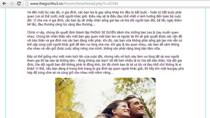 Chỉ cần vào trang web thegioithu3.vn sẽ thấy ngay một phòng se duyên les - gay, là nơi những người đồng tính tìm bạn khác giới để che mắt gia đình. Vừa click vào phòng se duyên sẽ thấy hiện ra lời dẫn của ban quản trị trang web nói về lý do các bạn đồng tính phải lừa dối mọi người: “Đây có thể giống như một màn kịch lớn của cuộc đời, nhưng nếu vở kịch này làm vui lòng tất cả mọi người tham gia thì tại sao lại không làm, đúng không các bạn? Sẽ tốt hơn nhiều là tự lừa dối bản thân, lừa dối gia đình, lừa dối người bạn đời không phải là đồng tính, khi đó chính bạn là kẻ có tội và đau khổ chứ không là ai khác! Vì thế nếu bạn đang ở trong tình trạng bị gia đình ép quen người khác giới, hãy tìm một les/gay phù hợp để cùng chia sẻ và cùng giữ cho nhau một niềm riêng”.