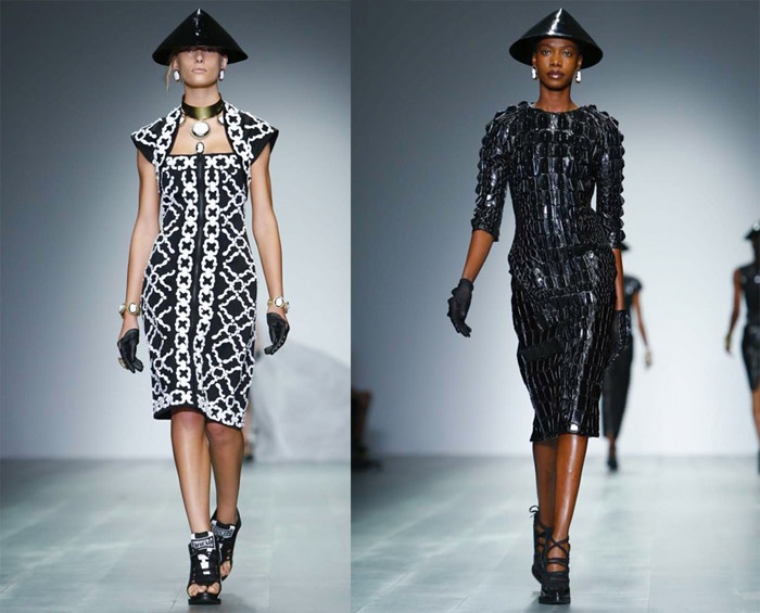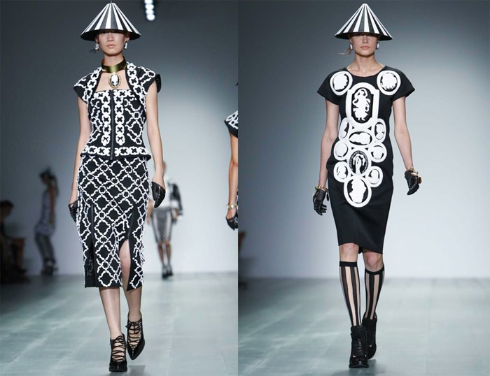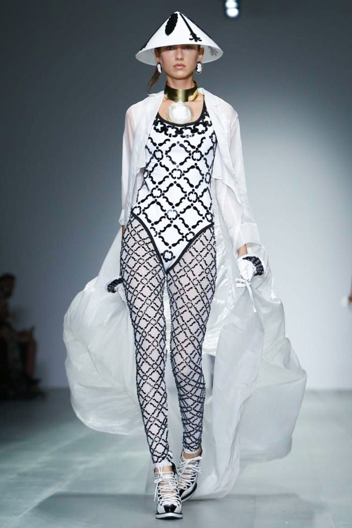 | Điểm độc đáo nhất trong BST KTZ là sự giao hòa quyến rũ của 2 gam màu cơ bản: trắng và đen, trên các thiết kế trang phục lẫn phụ kiện như mũ, giày … Đặc biệt, những chiếc mũ có hình dáng nón lá Việt Nam thu nhỏ đã thu hút sự chú ý của khán giả London. |