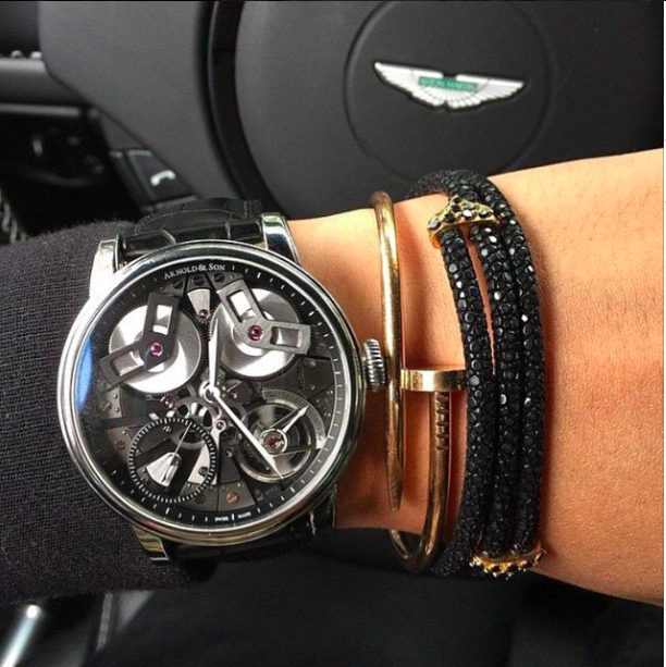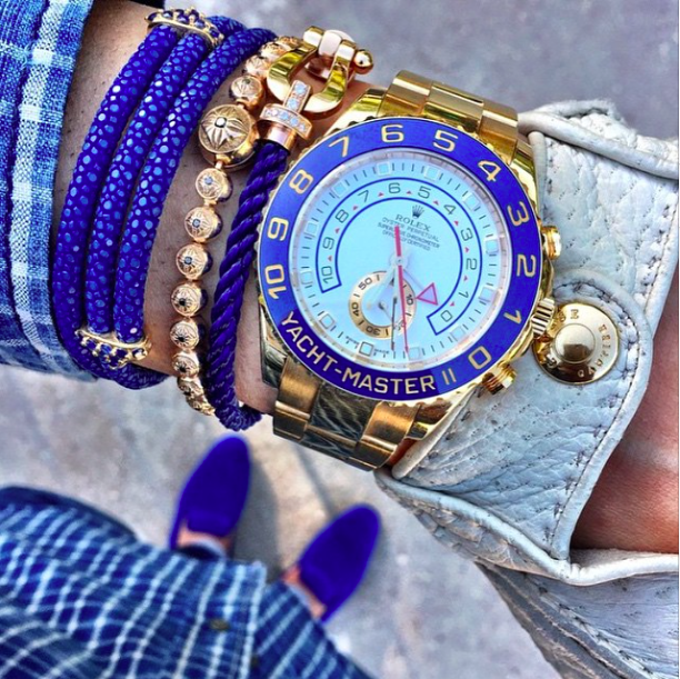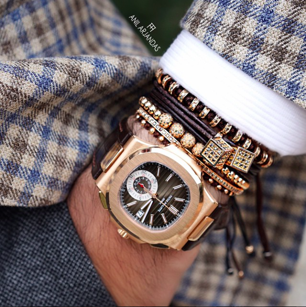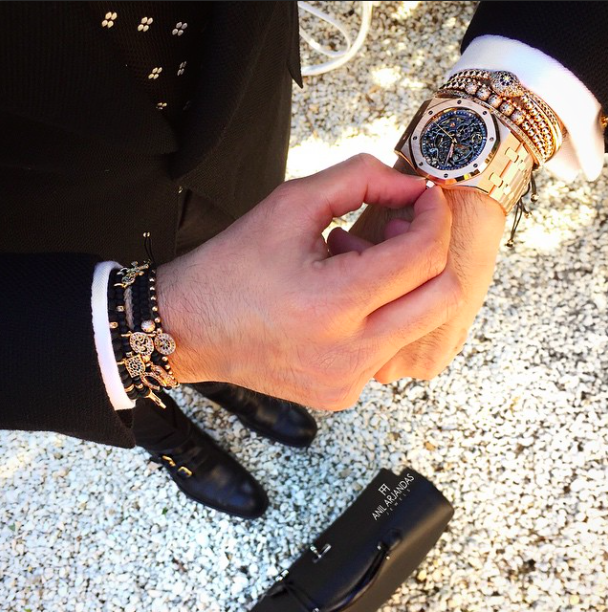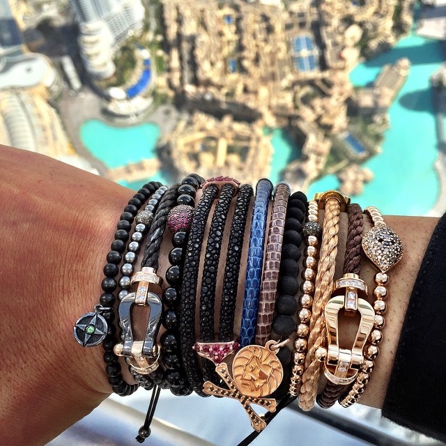 | Đeo vòng tay dạng layering cùng đồng hồ đang là cách phối phổ biến nhất. Trong hình là vòng tay của các thương hiệu Anil Arjandas, Fred và Shamballa Jewels. |