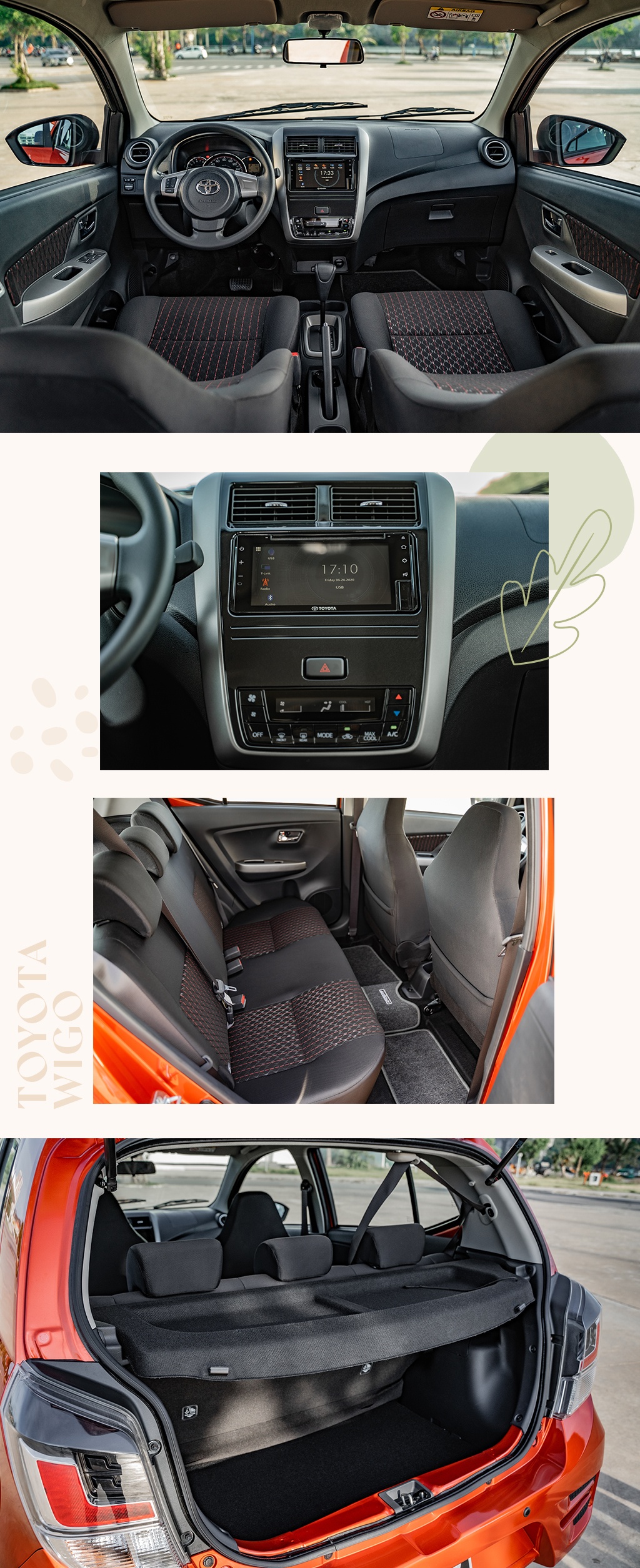Sở hữu kích thước nhỏ nhưng Wigo lại có nội thất rộng rãi với khoảng để chân và khoảng trần xe lớn, tạo sự thoải mái cho cả người lái và người đi cùng. Nhờ vậy, chuyến đi dã ngoại hay con đường về nhà giờ tan tầm trở nên dễ chịu hơn. Cốp xe cũng có dung tích tương đối lớn so với kích cỡ xe, giúp việc chở đồ đạc thuận tiện.