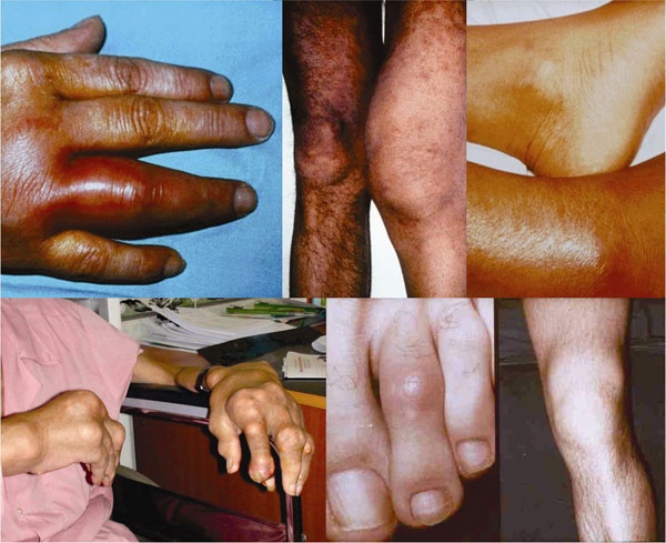 Theo BS Cao Thanh Ngọc (BV ĐH Y Dược TP.HCM), một số bệnh nhân có rất nhiều khớp bị đau, sưng. Biểu hiện ở các khớp nhỏ (bàn tay, ngón tay, cổ tay) và chi dưới. Bệnh còn kèm theo sốt, cứng khớp, không nắm chặt được. Cơn cứng khớp có thể kéo dài từ 30 phút đến một giờ.