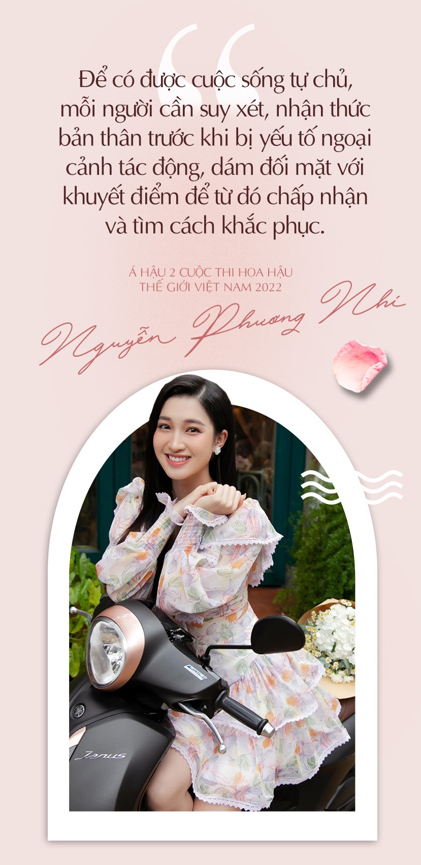 Với Nguyễn Phương Nhi - Á hậu 2 cuộc thi Hoa hậu Thế giới Việt Nam 2022 (Miss World Vietnam 2022), sống tự chủ là có khả năng làm chủ hành vi, suy nghĩ và cảm xúc cá nhân. Để có được cuộc sống tự chủ, mỗi người cần không ngừng suy xét, nhận thức chính xác về bản thân trước khi bị những yếu tố ngoại cảnh tác động; dám đối mặt với khuyết điểm, thiếu sót của mình để từ đó chấp nhận và tìm cách khắc phục.