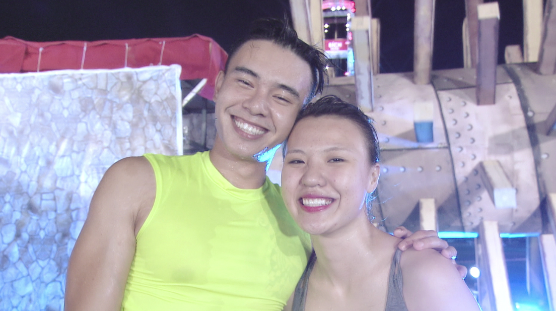 | Đông Hùng và Phương Linh đều uống no nước khi tham gia Sasuke. |