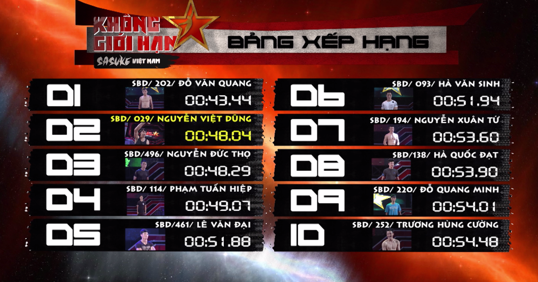 Ngoài hai khách mời, tập 10 Sasuke phiên bản Việt ghi nhận thêm 7 cái tên mới vào bảng tổng kết những thí sinh đã vượt qua Stage 1. Ông chủ quán cà phê Đinh Văn Tuấn về đích với thành tích 56 giây 33. Chiến binh này cho biết, hàng ngày, anh chỉ tập luyện bằng những dụng cụ có sẵn ở quán như lên xà bằng lan can hay cõng người.