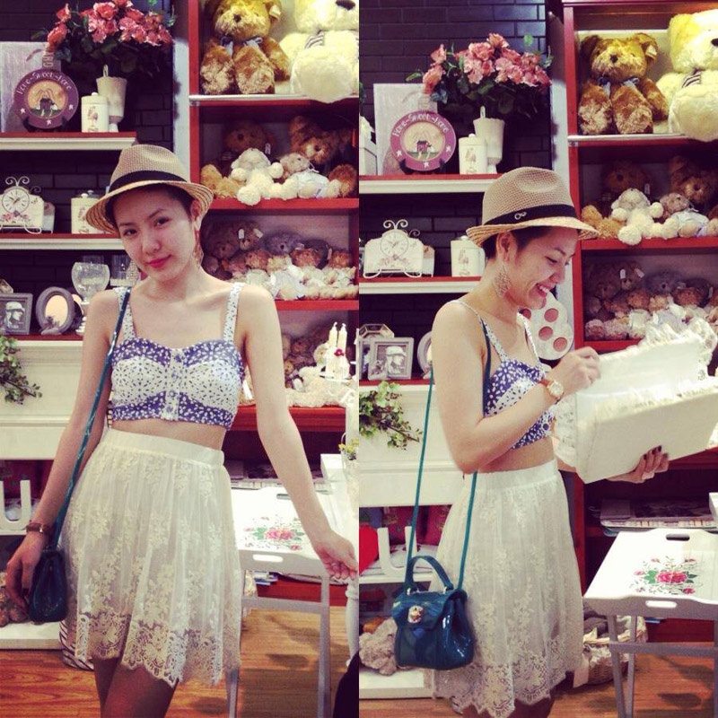 Gu thời trang của Phương Linh có sự đột phá với cách mix trang phục táo bạo, áo croptop và chân váy ren mỏng vừa nữ tính vừa khỏe khoắn.